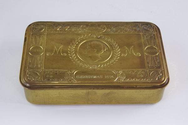 "The Princess Mary 1914 Christmas Gift - In November 1914, an advertisement was placed in the national press inviting monetary contributions to a 'Sailors & Soldiers Christmas Fund' which had been created by Princess Mary, the seventeen year old daughter of King George V and Queen Mary. The purpose was to provide everyone wearing the King's uniform and serving overseas on Christmas Day 1914 with a 'gift from the nation'. The response was truly overwhelming, and it was decided to spend the money on an embossed brass box, based on a design by Messrs Adshead and Ramsey. The contents varied considerably; officers and men on active service afloat or at the front received a box containing a combination of pipe, lighter, 1 oz of tobacco and twenty cigarettes in distinctive yellow monogrammed wrappers. Non-smokers and boys received a bullet pencil and a packet of sweets instead. Indian troops often got sweets and spices, and nurses were treated to chocolate. Many of these items were despatched separately from the tins themselves, as once the standard issue of tobacco and cigarettes was placed in the tin there was little room for much else apart from the greeting card The 'tin' itself was approximately 5" long by 3�" wide by 1�" deep with a double-skinned, hinged, lid. The surface of the lid depicts the head of Princess Mary in the centre, surrounded by a laurel wreath and flanked on either side by the 'M' monogram. At the top, a decorative cartouche contains the words 'Imperium Britannicum' with a sword and scabbard either side. On the lower edge, another cartouche contains the words 'Christmas 1914', which is flanked by the bows of battleships forging through a heavy sea. In the corners, small roundels house the names of the Allies: Belgium, Japan, Montenegro and Servia; France and Russia are at the edges, each superimposed on three furled flags or standards. "